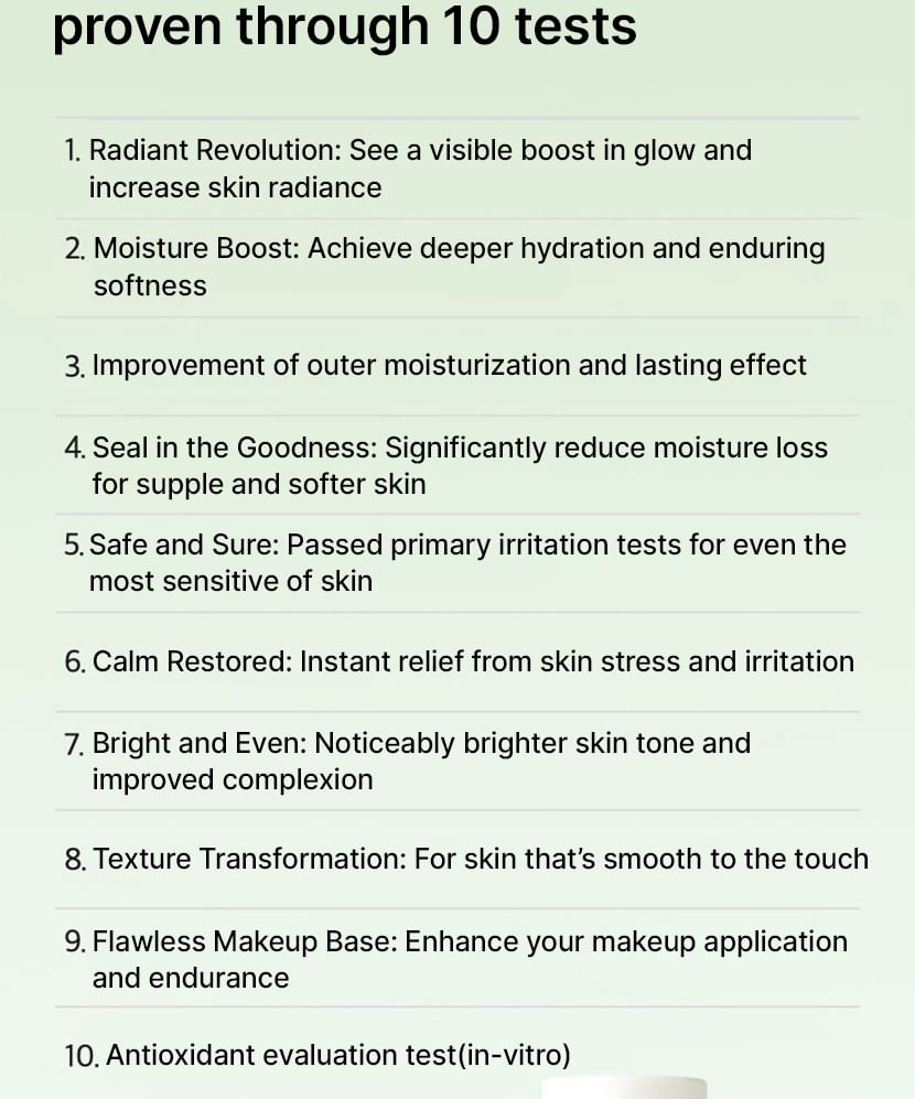 Used daily, it soothes irritated skin in a few days, improves skin tone uniformity, deeply hydrates and restores energy, firmness and radiance to the skin for a visibly healthier and more radiant face.
