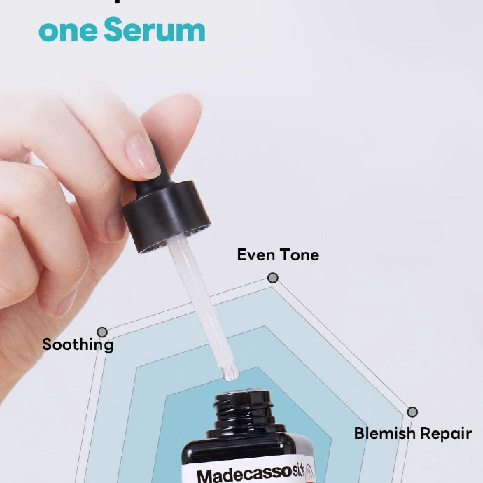Grâce à sa formule enrichie en Madecassoside, Centella Asiatica (Cica) et Niacinamide, ce sérum aide à calmer les rougeurs, améliorer l’apparence des imperfections et favoriser un teint plus uniforme et lumineux. Le Madecassoside et la Centella Asiatica (621 ppm) sont reconnus pour leurs propriétés apaisantes et réparatrices, aidant à renforcer la barrière cutanée et à protéger la peau contre les agressions extérieures, tandis que le Niacinamide (20 000 ppm) contribue à réduire l’apparence des taches, des marques post-acné et des taches de rousseur tout en améliorant l’éclat du teint.