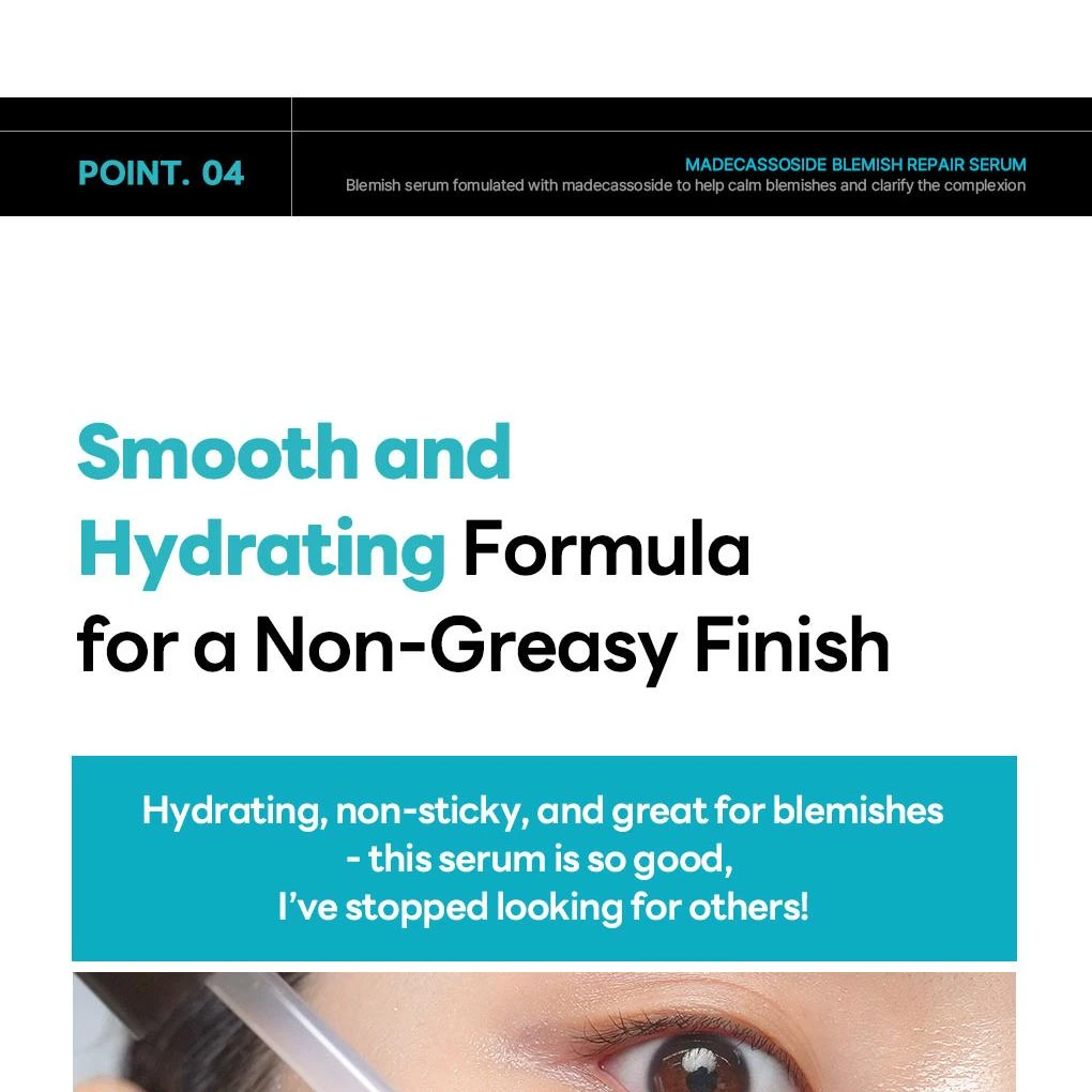 Le Madecassoside Blemish Repair Serum de MEDIHEAL est un sérum léger et non gras spécialement formulé pour cibler les taches pigmentaires, les imperfections et les marques d’acné, tout en apaisant les peaux sensibles ou stressées. Sa texture fluide et à absorption rapide pénètre facilement dans la peau sans laisser de film collant, ce qui permet de le superposer facilement avec d’autres soins dans votre routine quotidienne.