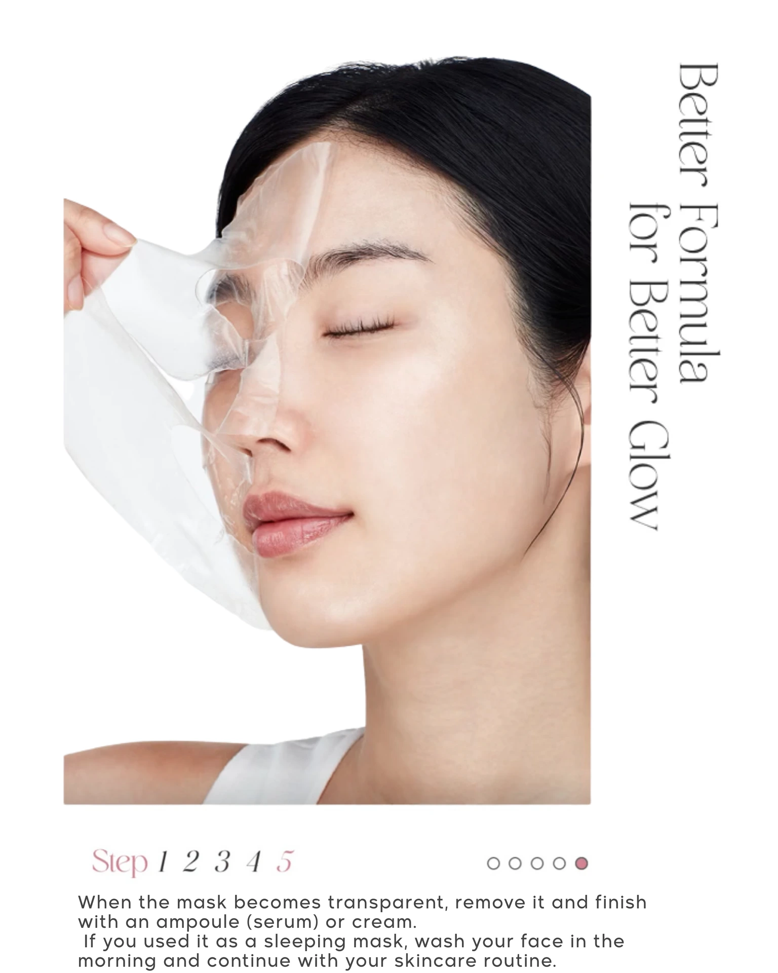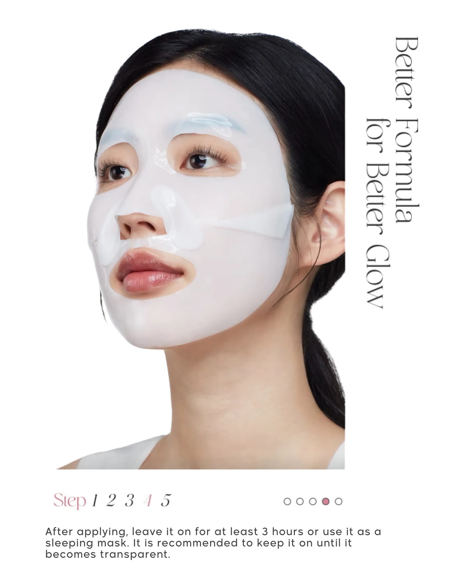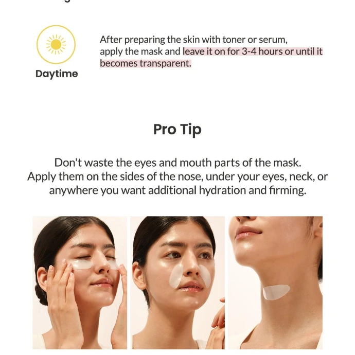 Day use: after preparing your skin with a toner or serum, apply the mask and leave it on for 3 to 4 hours, or until it becomes transparent.