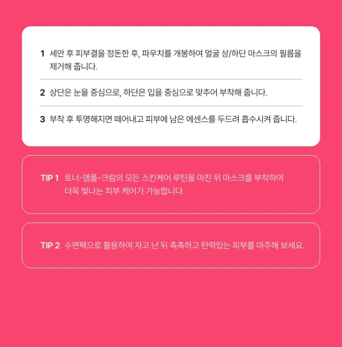 Commencez par nettoyer votre peau puis appliquez votre toner et votre sérum afin de bien préparer la peau à recevoir les actifs. Appliquez ensuite le masque en deux parties : la partie supérieure autour des yeux, puis la partie inférieure autour de la bouche, en ajustant correctement pour une bonne adhérence. Laissez poser pendant 3 à 4 heures, jusqu’à ce que le masque devienne transparent, signe que les ingrédients ont été absorbés. Retirez délicatement le masque puis massez l’excédent de produit sur le visage jusqu’à absorption complète.