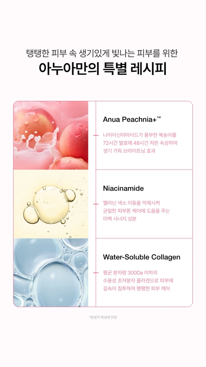 Prunus Persica (Pêche) Eau de Fruit, Eau, Dipropylène Glycol, Polydecène Hydrogéné, 1,2-Hexanediol, Glycérine, Niacinamide, Ferment de Lactobacillus, Copolymère d'Acrylates, Gomme de Ceratonia Siliqua (Caroube), Gomme Xanthane, Carraghénane, Hydroxyacétonphénone, Sucrose, Allantoïne, Chlorure de Potassium, Polyacrylate de Sodium, Glycyrrhizate de Dipotassium, Gomme de Cellulose, Gomme de Gellan, Glycol Caprylique, Adénosine, Éthylhexylglycérine, Phytate de Sodium, Collagène Soluble, Hyaluronate de Sodium, Maltodextrine, Extrait de Fruit de Rubus Idaeus (Framboise), Extrait de Fruit de Rubus Coreanus, Extrait de Fleur de Prunus Persica (Pêche), Extrait de Fruit de Prunus Persica (Pêche), Extrait de Fleur de Prunus Serrulata, Hydroxypropyltrimonium Hyaluronate, Salicylate de Bétain, Citrate de Sodium, Hyaluronate Acétylé de Sodium, Acide Citrique, Acide Hyaluronique Hydrolysé, Acide Hyaluronique, Cyanocobalamine, Crosspolymère d'Hyaluronate de Sodium, Hyaluronate de Sodium Hydrolysé, Hyaluronate de Potassium, Oxydes de Fer (CI 77491)