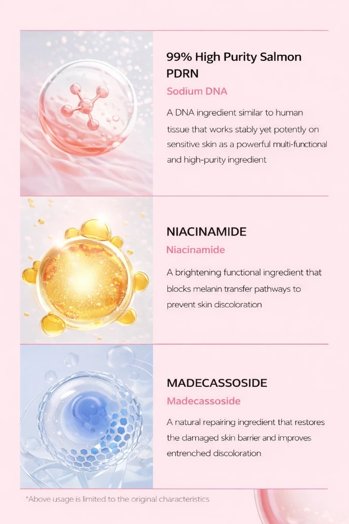 Eau, Glycérine, Méthylpropanediol, Niacinamide, Xylitol, Hydroxyacétophénone, Octyldodéceth-16, Diglycérine, Allantoïne, Gomme de cellulose, Éthylhexylglycérine, Hydroxyéthylcellulose, Citrate de sodium, Gluconate de sodium, Dipropylène glycol, Adénosine, Glycol butylique, 1,2-Hexanediol, Acide citrique, Cyanocobalamine, Huile de fleur de camomille, Extrait de chou, Eau de fleur de Rosa Damascena, Extrait de fruit de Prunus Persica (pêche), Extrait de Thuja Orientalis, Eau de fleur de Jasminum Officinale (jasmin), Extrait de fleur de Citrus Aurantium Amara (orange amère), Extrait de Centella Asiatica, Extrait d'oignon, Extrait de Chamomilla Recutita (matricaire), Extrait de Salvia Officinalis (sauge), Huile de feuille de Rosmarinus Officinalis (romarin), Extrait de feuille/tige d'Hedera Helix (lierre), Extrait de fruit de Cucumis Melo (melon), Extrait de fruit d'Abelmoschus Esculentus (gombo), Extrait de Petroselinum Crispum (persil), Extrait de feuille de Corchorus Olitorius, Extrait de racine de Polygonum Cuspidatum, Collagène, Extrait d'Artemisia Capillaris, Extrait de fleur de Nelumbo Nucifera, Extrait de Oryza Sativa (riz), Extrait de fermentation de levure, ADN de sodium, Acide salicylique capryloyl, Triglycéride caprylique/caprique, Phosphatidylcholine hydrogénée, Stéarate de saccharose, Extrait de graine de Vigna Radiata (haricot mungo), Lécithine hydrogénée, Alcool cétylique et stéarylique, Rétinol, Myristate de polyglycéryle-10, Acétate de tocophérol, Asiaticoside, Acide madecassique, Madecassoside, Acide asiatique.