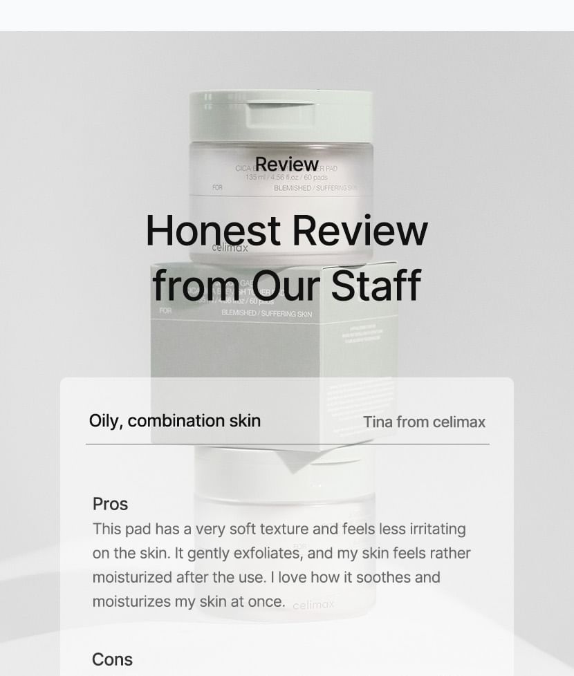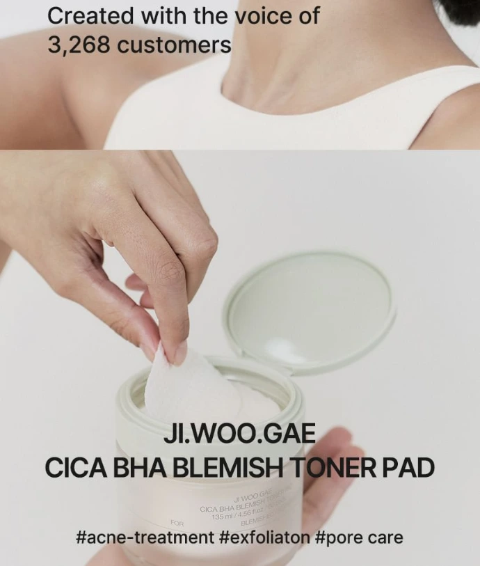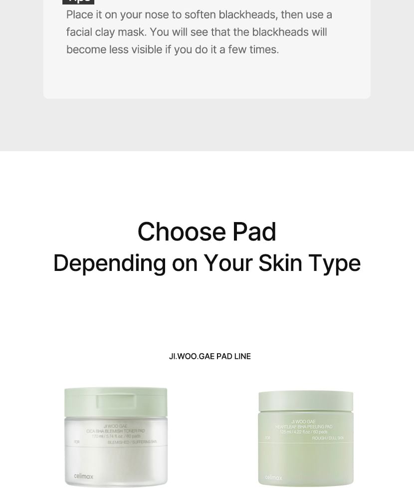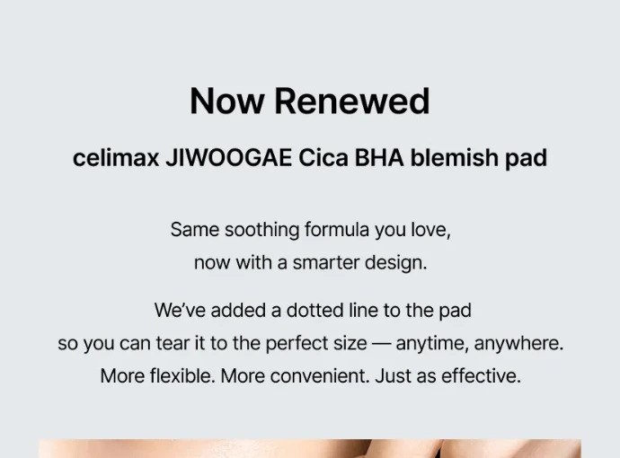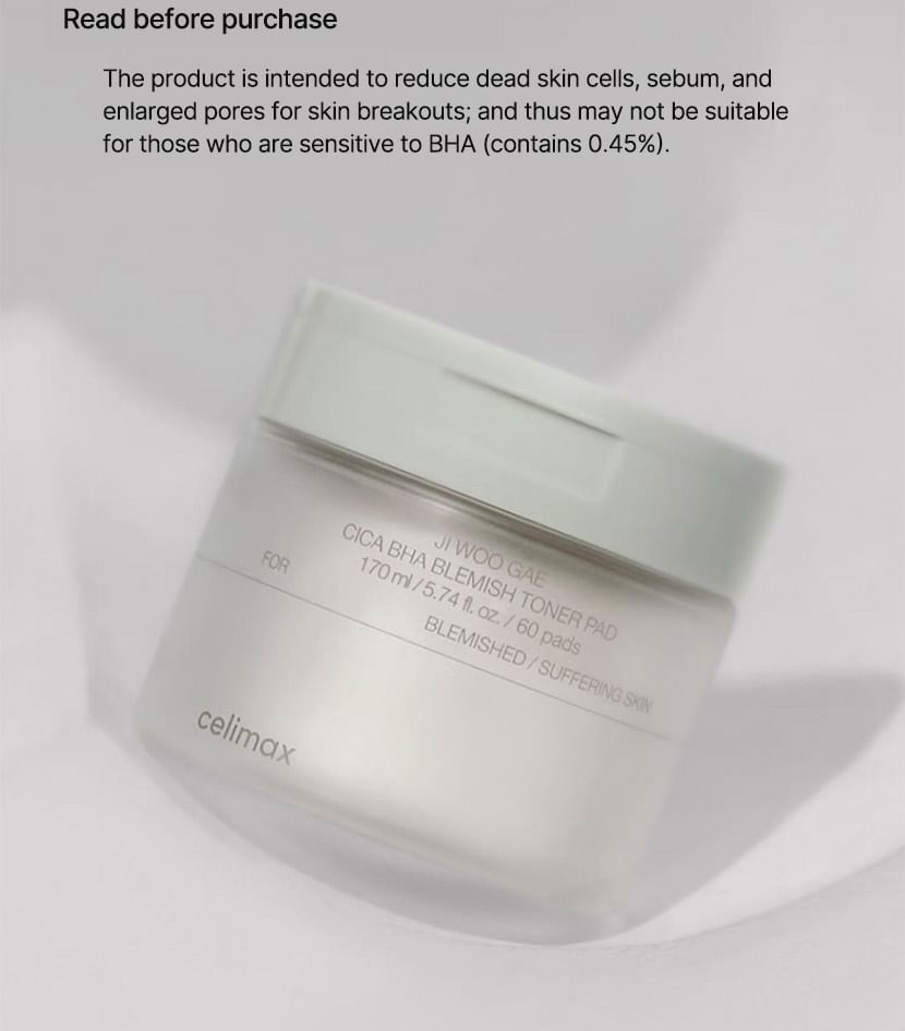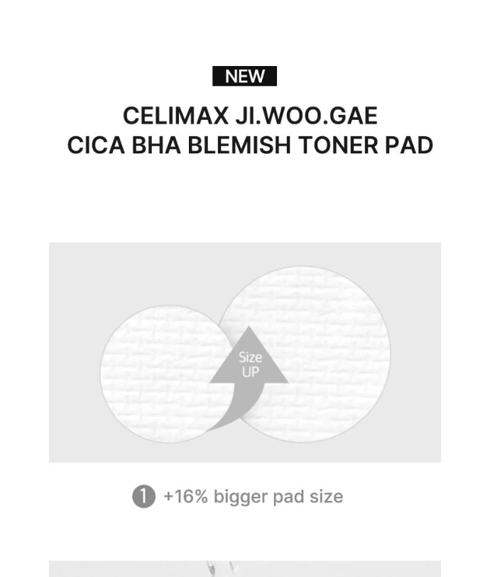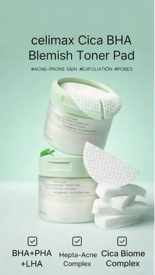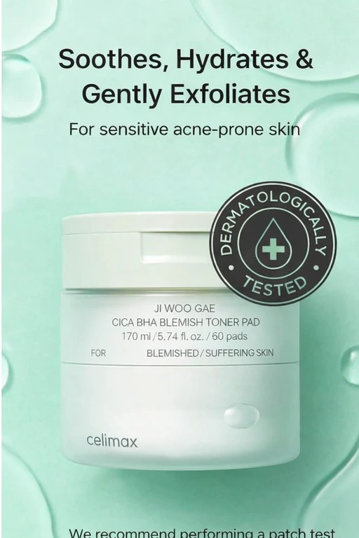 De Ji Woo Gae Cica BHA Blemish Toner Pads van CELIMAX zijn exfoliërende schijven doordrenkt met toner, ontworpen voor huid die gevoelig is voor onzuiverheden, of acne-gevoelig is. Hun formule combineert BHA, PHA en LHA, een exfoliërend complex van biotechnologie dat helpt om dode huidcellen zachtjes te verwijderen, de poriën te ontstoppen en de textuur van de huid te verzachten zonder irritatie of uitdroging te veroorzaken.