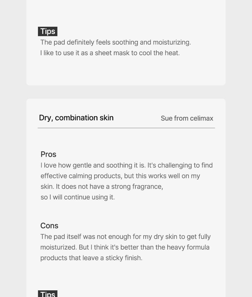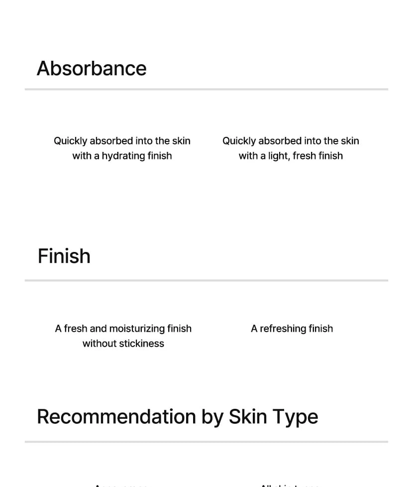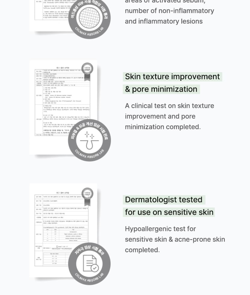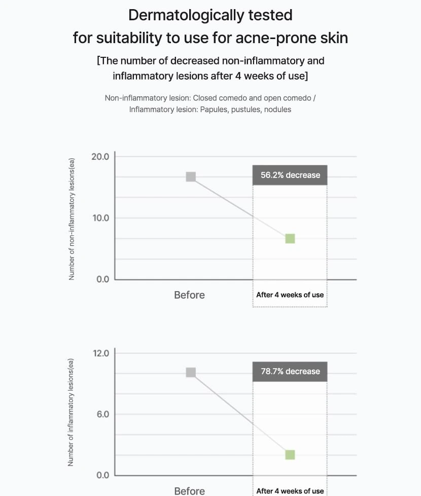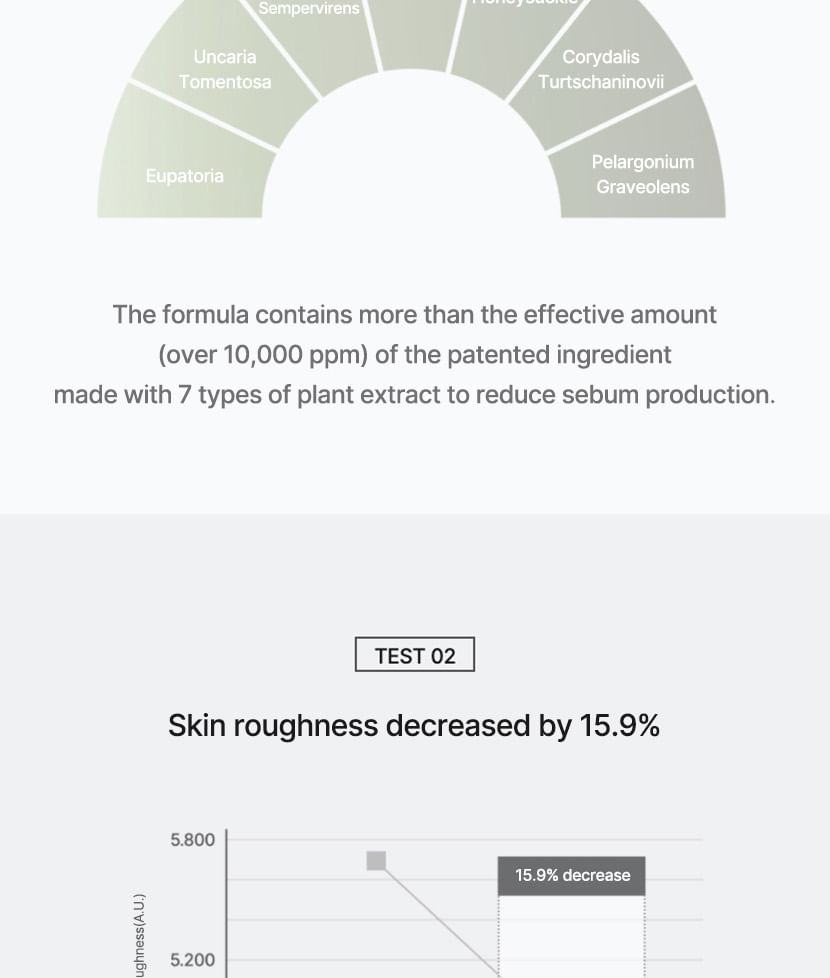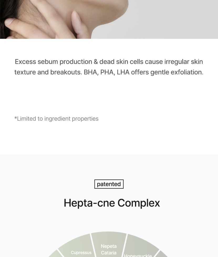 Verrijkt met Cica Biome Complex, met name met Centella Asiatica, ze kalmeren roodheid en ontstekingen terwijl ze de huid helpen haar evenwicht te herstellen. De Hepta-cne Complex, samengesteld uit zeven plantenextracten, helpt de overmatige talgproductie te beheersen en de verschijning van onzuiverheden te verminderen, terwijl het extract van camelia bloem bijdraagt aan het verkleinen van de poriën en het verbeteren van het algemene uiterlijk van de huid.
