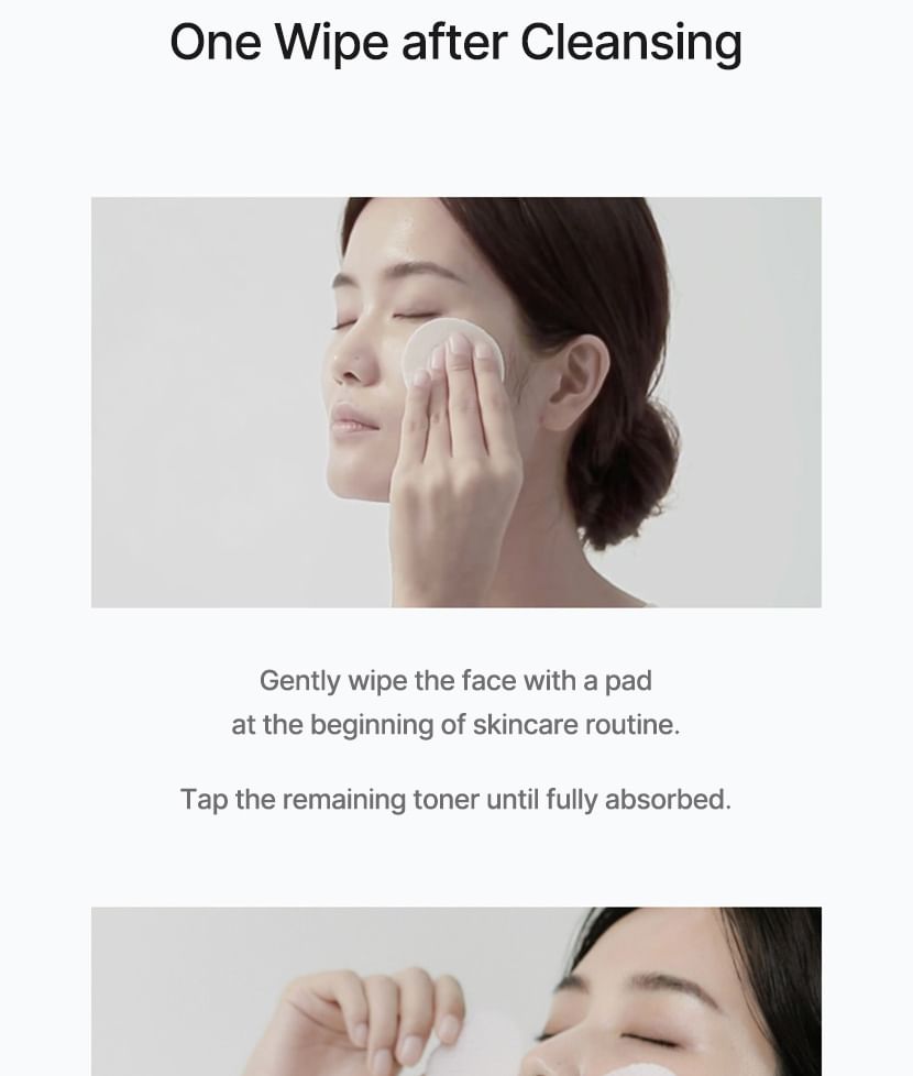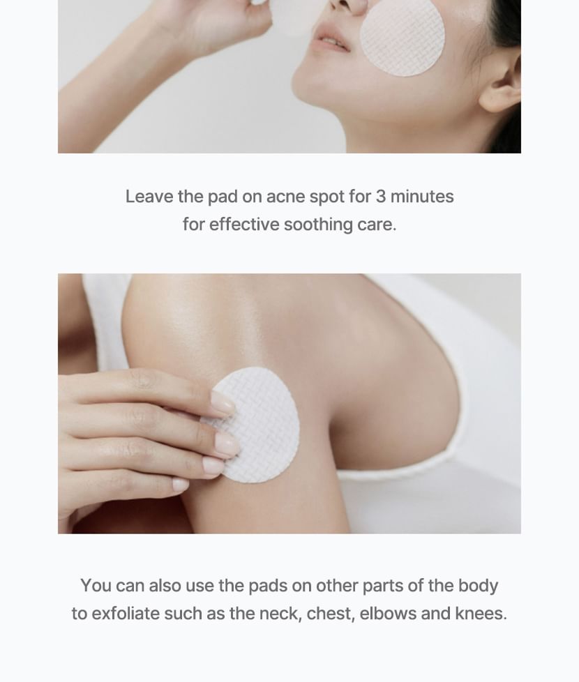 Op een schoneendroge huid, aan het begin van uw huidverzorgingsroutine, veeg voorzichtig een pad over het hele gezicht om dode huidcellen, overtollig talg en onzuiverheden te verwijderen met de gewafelde kant van het pad. Dep vervolgens zachtjes op de huid om de absorptie van de resterende toner te bevorderen. Voor een gerichte kalmerende werking kunt u het pad ook ongeveer 3 minuten met de gladde kant van het pad op een probleemgebied laten liggen.