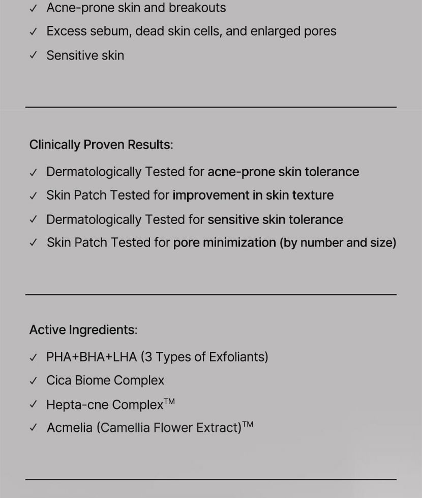 - Exfolieert zachtjes dankzij BHA, PHA en LHA