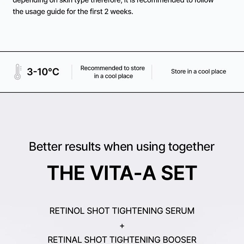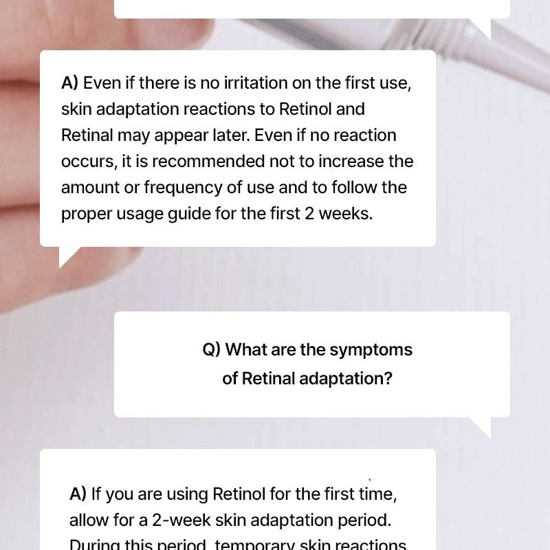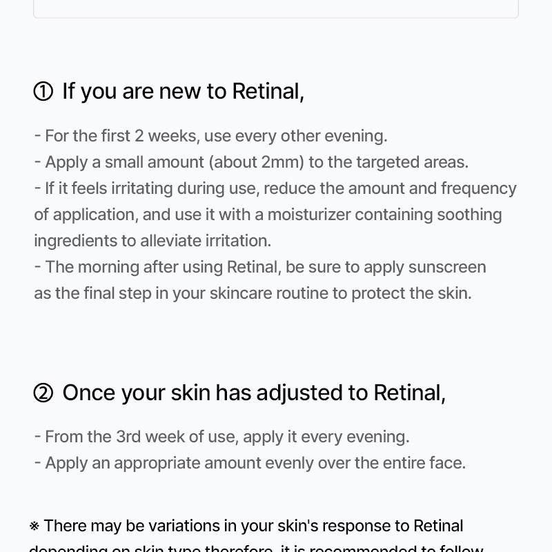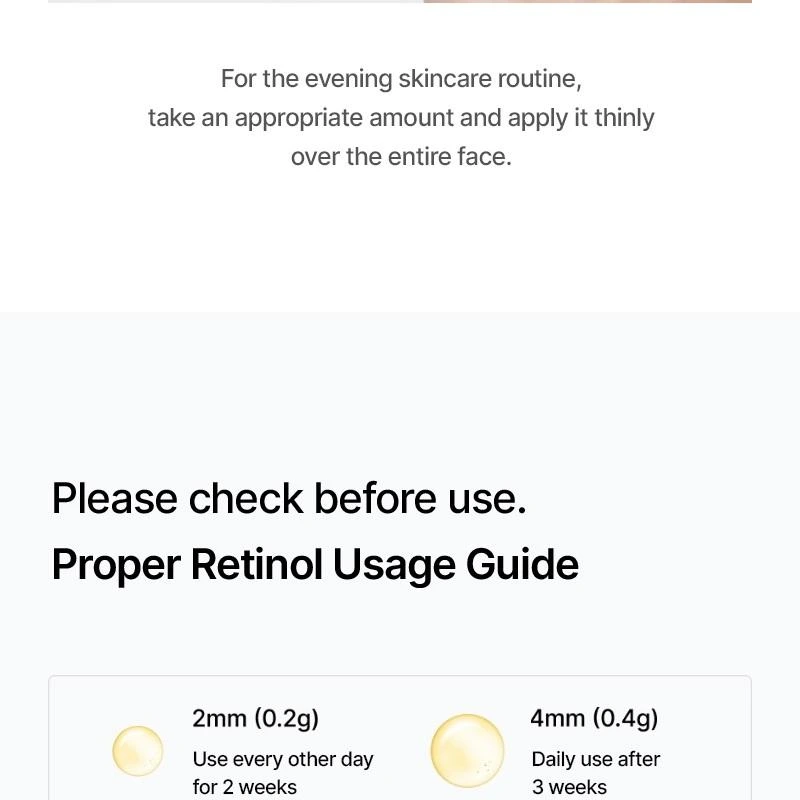 Si vous débutez avec le rétinol ou le retinal, il est recommandé d’appliquer le produit un soir sur deux pendant les deux premières semaines afin de permettre à la peau de s’adapter en douceur. Commencez par utiliser une petite quantité (environ 2 mm / 0,2 g) sur les zones ciblées, puis augmentez progressivement si votre peau le tolère bien.