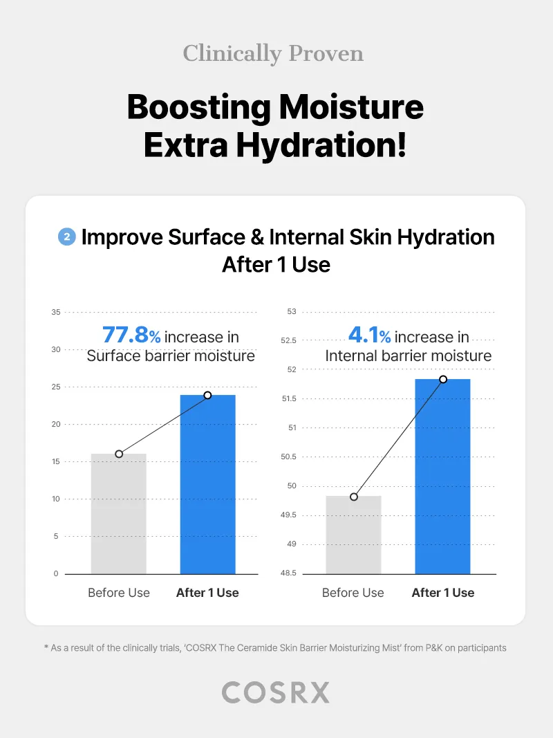 La The Ceramide Skin Barrier Moisturizing Mist de COSRX est une brume hydratante et réparatrice conçue pour les peaux sensibles, sèches, déshydratées et stressées, offrant bien plus qu’une simple hydratation. Grâce à sa formule avancée, elle procure une hydratation intense et durable tout en renforçant la barrière cutanée et en aidant à protéger la peau des agressions extérieures.