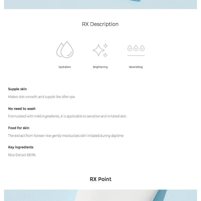Extrait d'Oryza Sativa (riz), butylène glycol, glycérine, huile de graines d'Helianthus Annuus (tournesol), bétaïne, niacinamide, diméthicone, 1,2-hexanediol, olivate de cétyle, olivate de sorbitan, huile d'Elaeis Guineensis (palme), huile de noyau d'Elaeis Guineensis (palme), copolymère d'acrylate d'hydroxyéthyle/sodium acryloyldiméthyl taurinate, alcool cétylique, éthylhexylglycérine, arginine, carbomère, allantoin, gomme xanthane