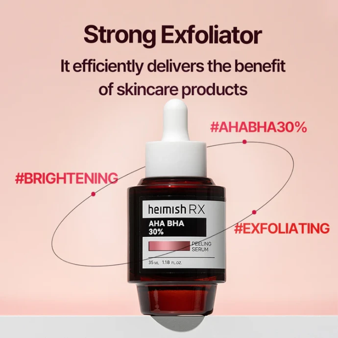 Découvrez RX AHA BHA Peeling Serum de HEIMISH, un sérum puissant pour peaux à imperfections, pores obstrués et teint terne. Sa formule concentrée en AHA et BHA exfolie efficacement : les AHA lissent le grain de peau en éliminant les cellules mortes, tandis que les BHA désobstruent les pores en profondeur. Idéal pour améliorer la texture, réduire l'effet "cakey" et raviver l'éclat, ce soin convient à ceux cherchant une exfoliation rapide et efficace, tout en étant doux pour les peaux tolérantes aux acides. Résultat : une peau plus douce, claire et éclatante dès les premières utilisations.