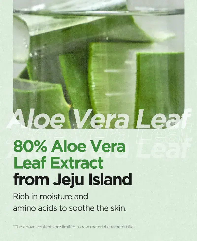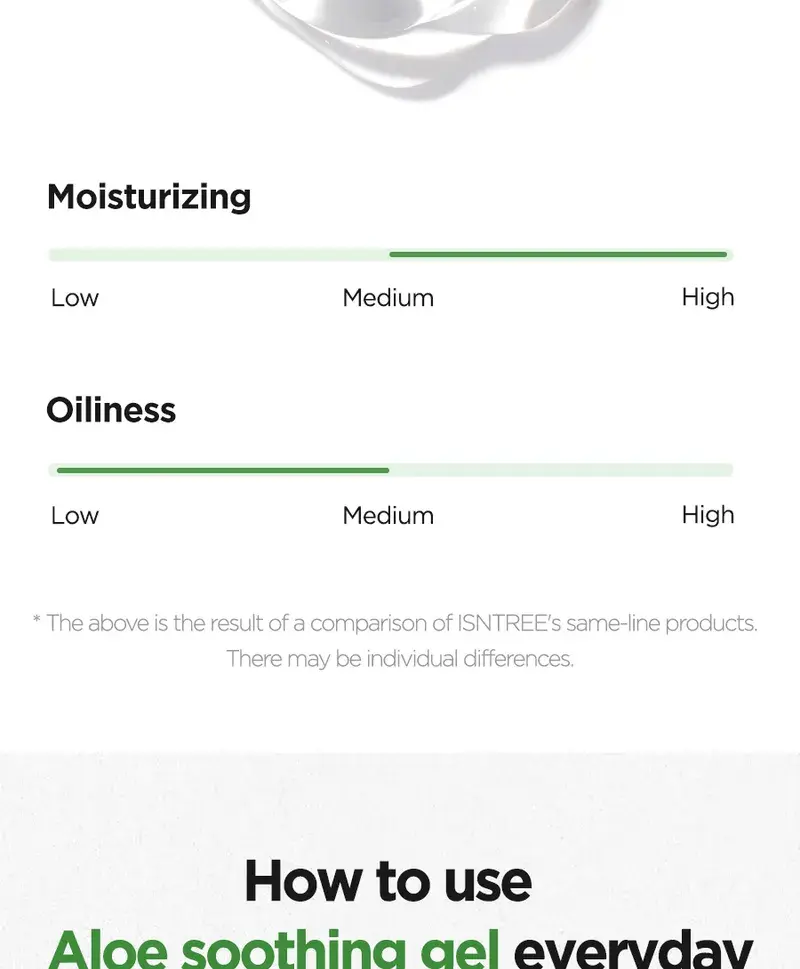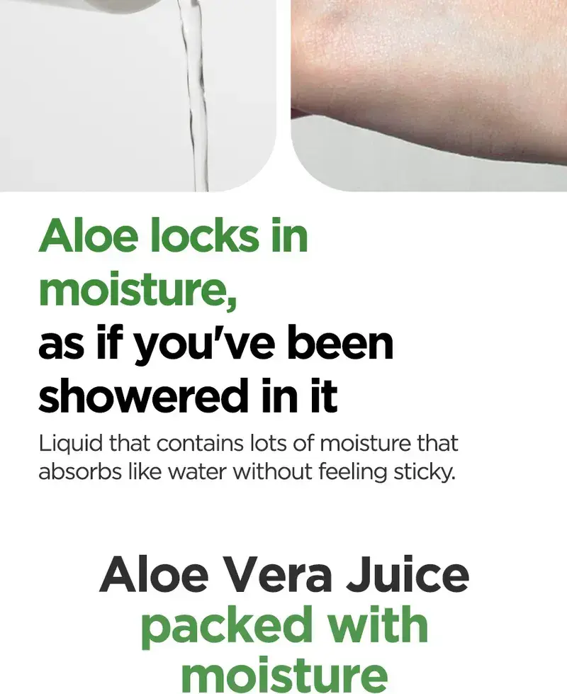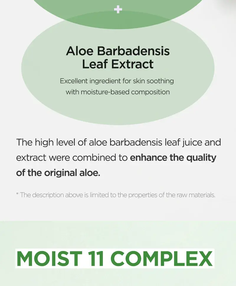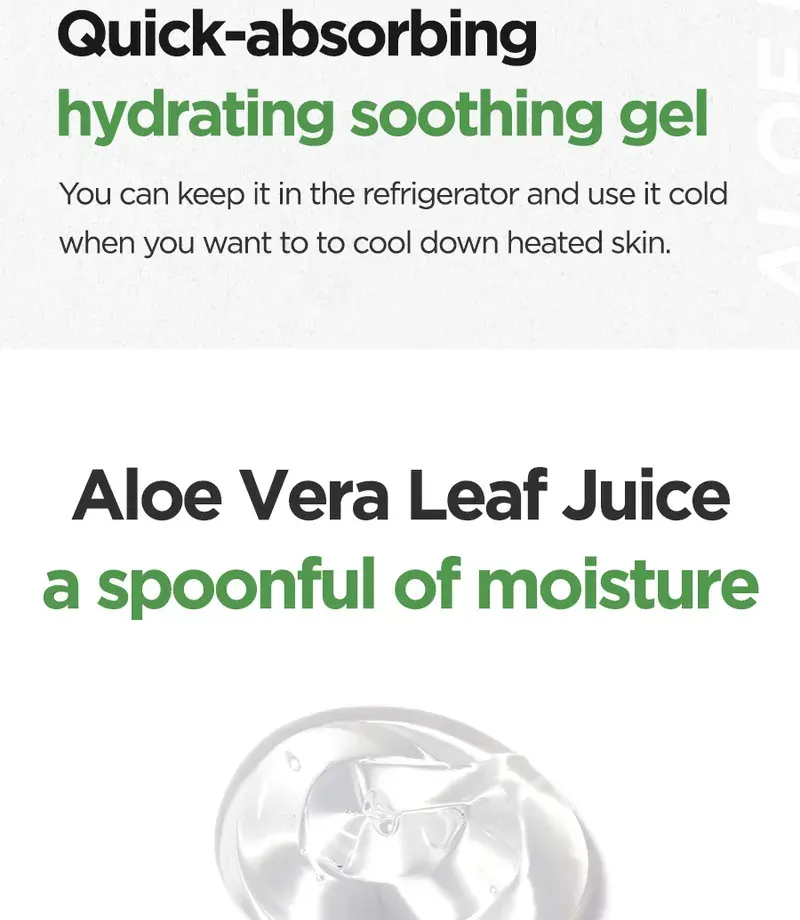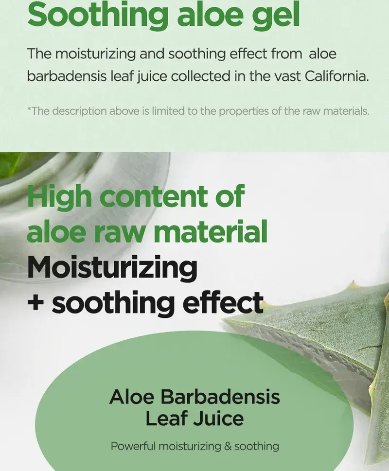 Aloe Soothing Gel Moisture : Jus de feuille d’Aloe Barbadensis (Aloe Vera), eau, butylène glycol, glycérine, extrait de Centella Asiatica (Gotu Kola), extrait de feuille de Camellia Sinensis (thé vert), extrait de racine de Glycyrrhiza Glabra (réglisse), hyaluronate de sodium, bétaïne, tréhalose, extrait de Punica Granatum (grenade), extrait de fruit de Ficus Carica (figue), extrait de fruit de Morus Alba, extrait de fruit de Luffa Cylindrica (Luffa Aegyptiaca), extrait de noix de Ginkgo Biloba (Maidenhair Tree), extrait de feuille d’Aloe Barbadensis (Aloe Vera), Acide hyaluronique hydrolysé, hyaluronate d’hydroxypropyltrimonium, acide hyaluronique, polymère croisé d’hyaluronate de sodium, cétone de framboise, acide polyglutamique, méthylpropanediol, allantoïne, panthénol, arginine, benzylglycol, hydroxyacétophénone, éthylhexylglycérine, caprylyl glycol, acide citrique, dipropylène glycol, glycyrrhizate dipotassique, carbomère, 1,2-hexanediol