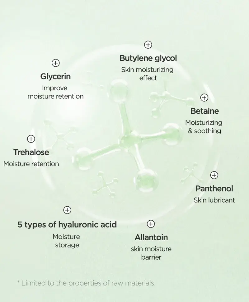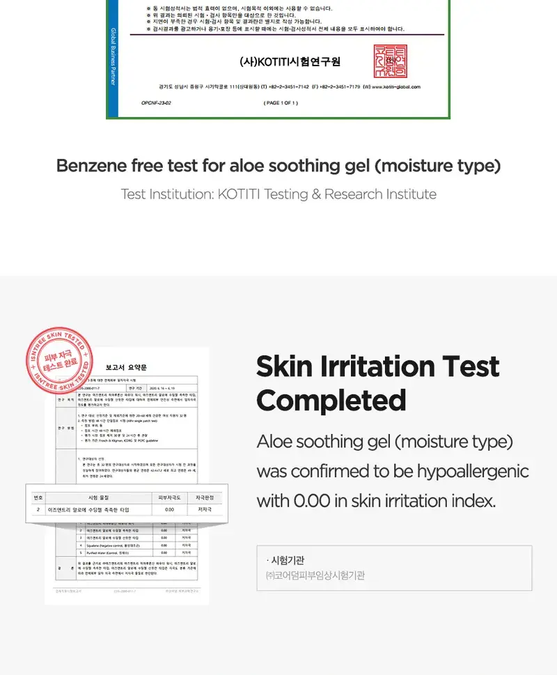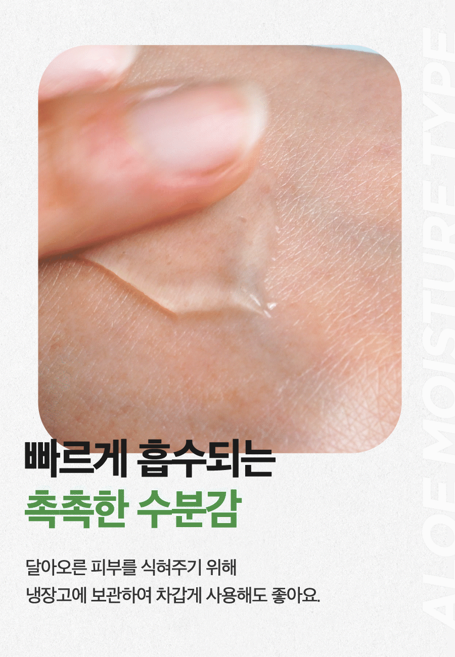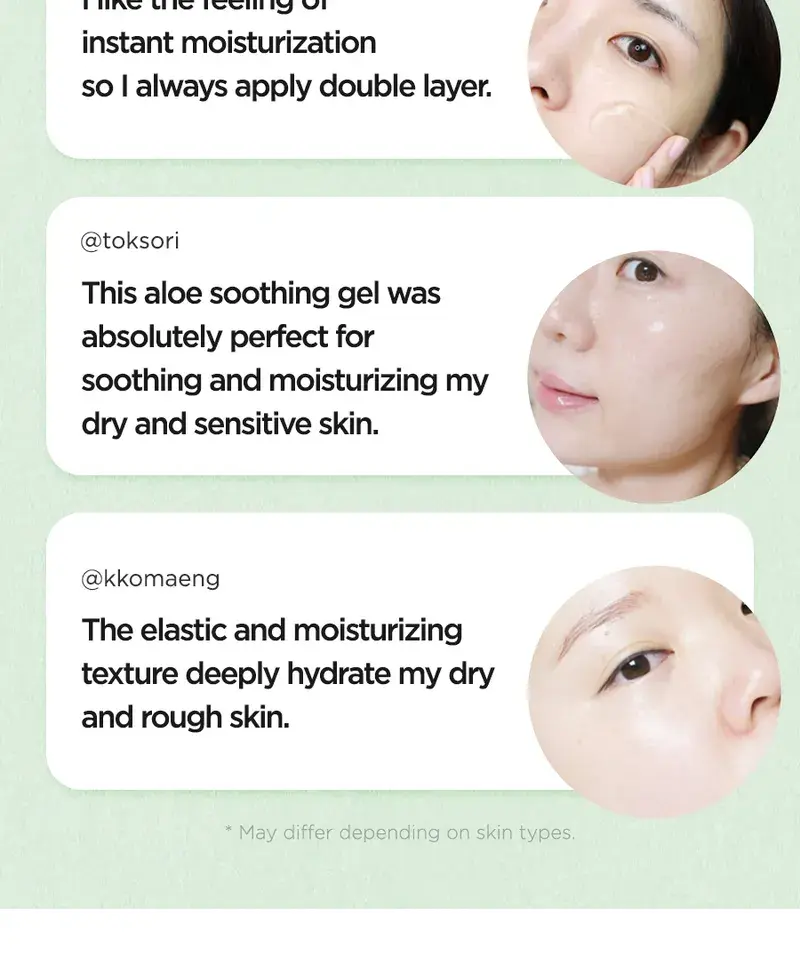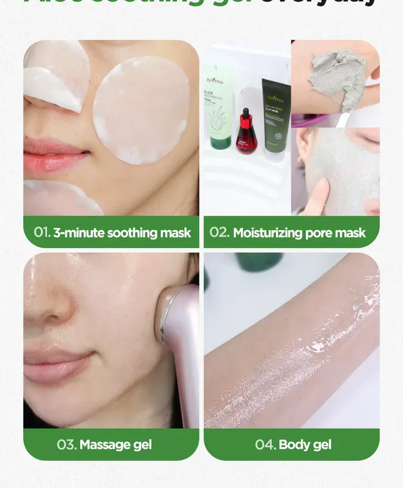 Aloe Soothing Gel Moisture : Jus de feuille d’Aloe Barbadensis (Aloe Vera), eau, butylène glycol, glycérine, extrait de Centella Asiatica (Gotu Kola), extrait de feuille de Camellia Sinensis (thé vert), extrait de racine de Glycyrrhiza Glabra (réglisse), hyaluronate de sodium, bétaïne, tréhalose, extrait de Punica Granatum (grenade), extrait de fruit de Ficus Carica (figue), extrait de fruit de Morus Alba, extrait de fruit de Luffa Cylindrica (Luffa Aegyptiaca), extrait de noix de Ginkgo Biloba (Maidenhair Tree), extrait de feuille d’Aloe Barbadensis (Aloe Vera), Acide hyaluronique hydrolysé, hyaluronate d’hydroxypropyltrimonium, acide hyaluronique, polymère croisé d’hyaluronate de sodium, cétone de framboise, acide polyglutamique, méthylpropanediol, allantoïne, panthénol, arginine, benzylglycol, hydroxyacétophénone, éthylhexylglycérine, caprylyl glycol, acide citrique, dipropylène glycol, glycyrrhizate dipotassique, carbomère, 1,2-hexanediol