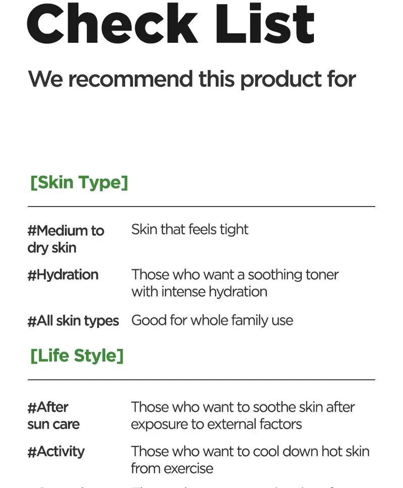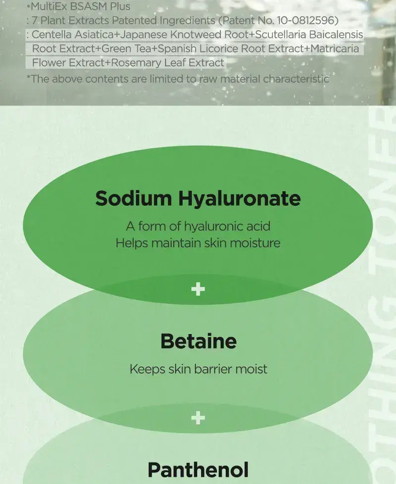 Aloe Soothing Toner : Extrait de feuille d’aloe vera, eau purifiée, méthylpropanediol, propanediol, hyaluronate de sodium, extrait de Centella Asiatica, extrait de racine de Polygonum Cuspidatum, extrait de racine de Scutellaria Baicalensis, extrait de feuille de Camellia Sinensis, extrait de racine de Glycyrrhiza Glabra (réglisse), extrait de fleur de Camomilla Recutita (Matricaria), extrait de feuille de Rosemarinus Officinalis (romarin), acide polygiutamique, allantoïne, glycyrhizate dipotassique, tréhalose, bétaïne, panthénol, trométhamine, acrylates/acrylate d’alkyle C10-30 Polymère croisé, EDTA disodique, hydroxyacétophénone