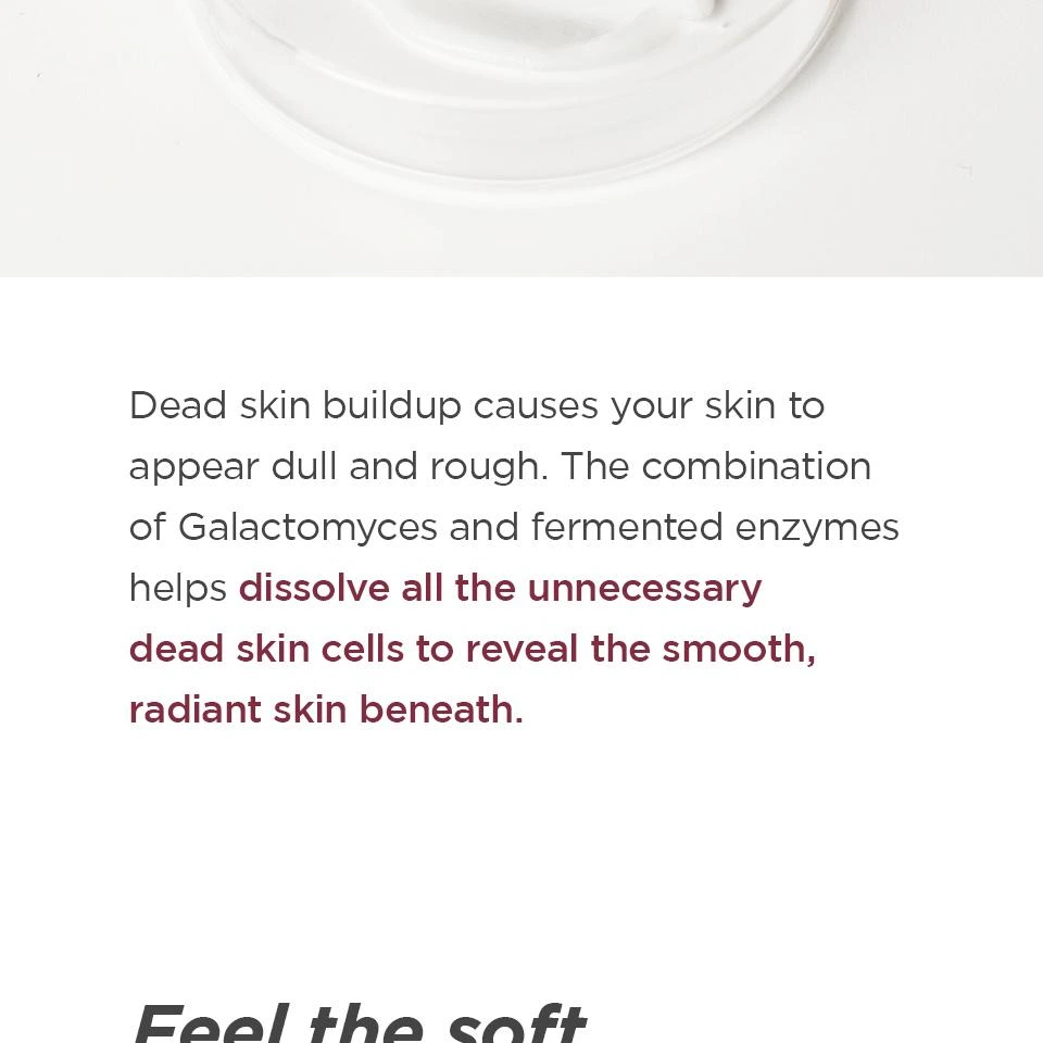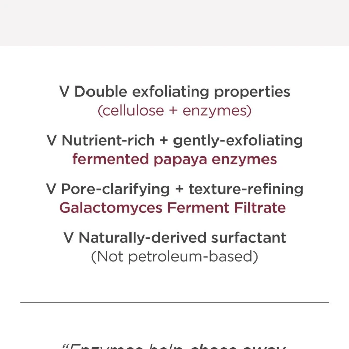 Sa formule utilise des enzymes fermentées qui exfolient délicatement en retirant les cellules mortes, les impuretés et l’excès de sébum, laissant la peau plus lisse, douce et lumineuse. Enrichi en Galactomyces, il aide à améliorer et réparer la texture de la peau pour un teint plus uniforme et éclatant. La sève de bouleau apporte une hydratation intense et aide à maintenir une peau fraîche, souple et parfaitement équilibrée.