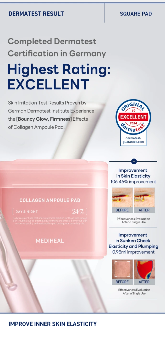 Les Collagen Ampoule Pads de MEDIHEAL sont des disques de coton doux pré-imbibés d’une ampoule riche en collagène conçus pour nourrir, hydrater et améliorer l’élasticité de la peau au quotidien.