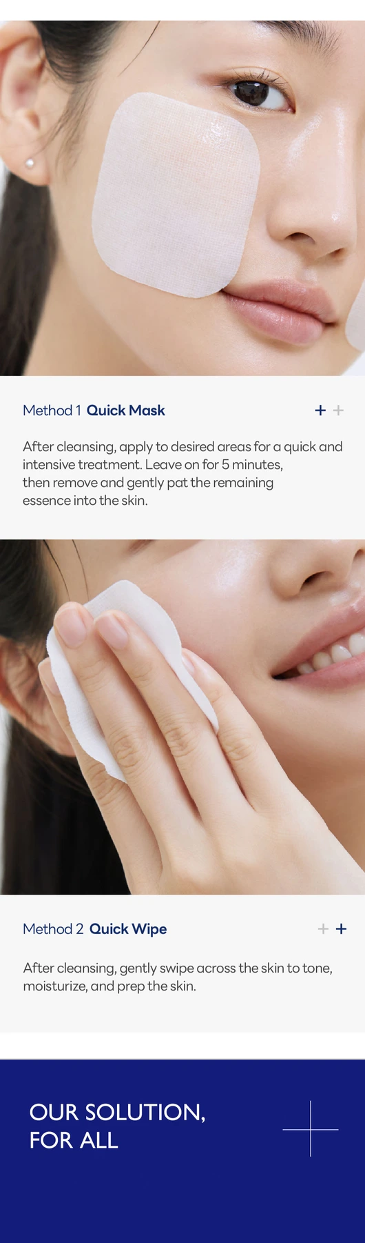 En masque ciblé : après le nettoyage, appliquez les pads sur les zones du visage comme le front, les joues ou le menton pour un soin intensif. Laissez poser environ 15 minutes, puis retirez-les et tapotez délicatement pour faire pénétrer l’essence restante.
