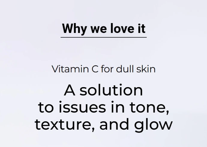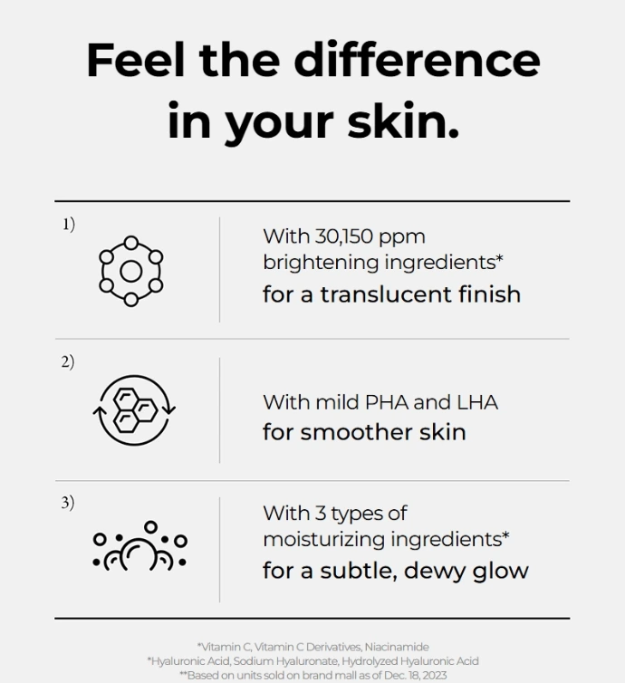Sa formule associe vitamine C stabilisée (30 150 ppm), niacinamide et curcuma afin d’aider à uniformiser le teint, raviver l’éclat naturel de la peau et réduire l’aspect terne. Les PHA et LHA exfolient délicatement pour lisser la texture et affiner le grain de peau, tandis que l’acide hyaluronique et trois agents hydratants apportent une hydratation légère, fraîche et non collante pour une peau confortable et lumineuse.