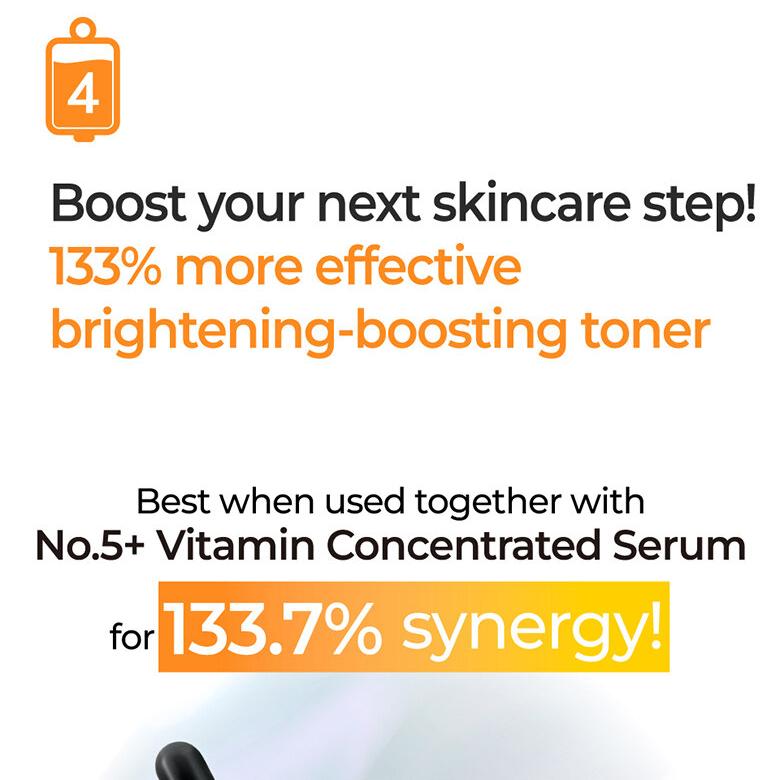 Cliniquement testée, il aide à réduire les taches jusqu’à 18,12 % et voit son efficacité augmentée de 133 % avec le sérum No.5+. Sa texture légère et rapidement absorbée prépare la peau à mieux recevoir les soins suivants tout en offrant une hydratation immédiate et un léger effet resurfaçant.