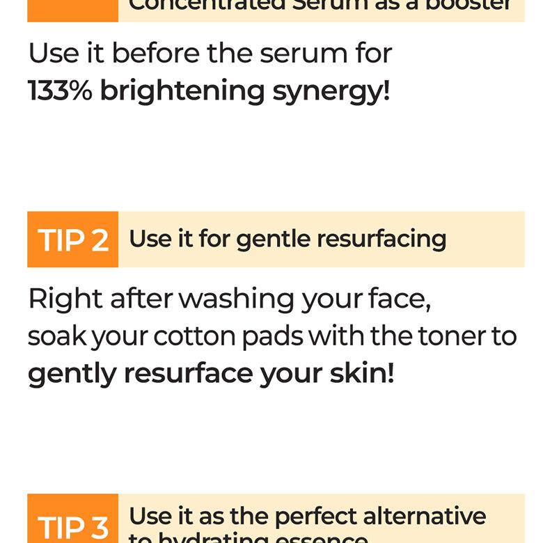 Astuce : Vous pouvez également l’utiliser avec un coton imbibé pour un resurfaçage doux, aidant à lisser la texture de la peau et raviver l’éclat. Enfin, elle peut s’appliquer directement avec les mains en tapotant comme une essence hydratante légère.