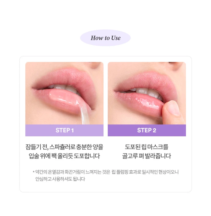 Appliquez le masque en couche généreuse sur les lèvres avant de dormir à l’aide d’une spatule, puis étalez-le uniformément pour une absorption optimale ; une légère sensation de chaleur ou de picotement peut apparaître, signe de son effet repulpant temporaire