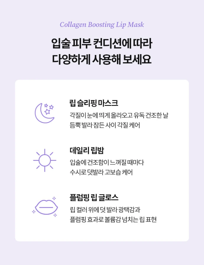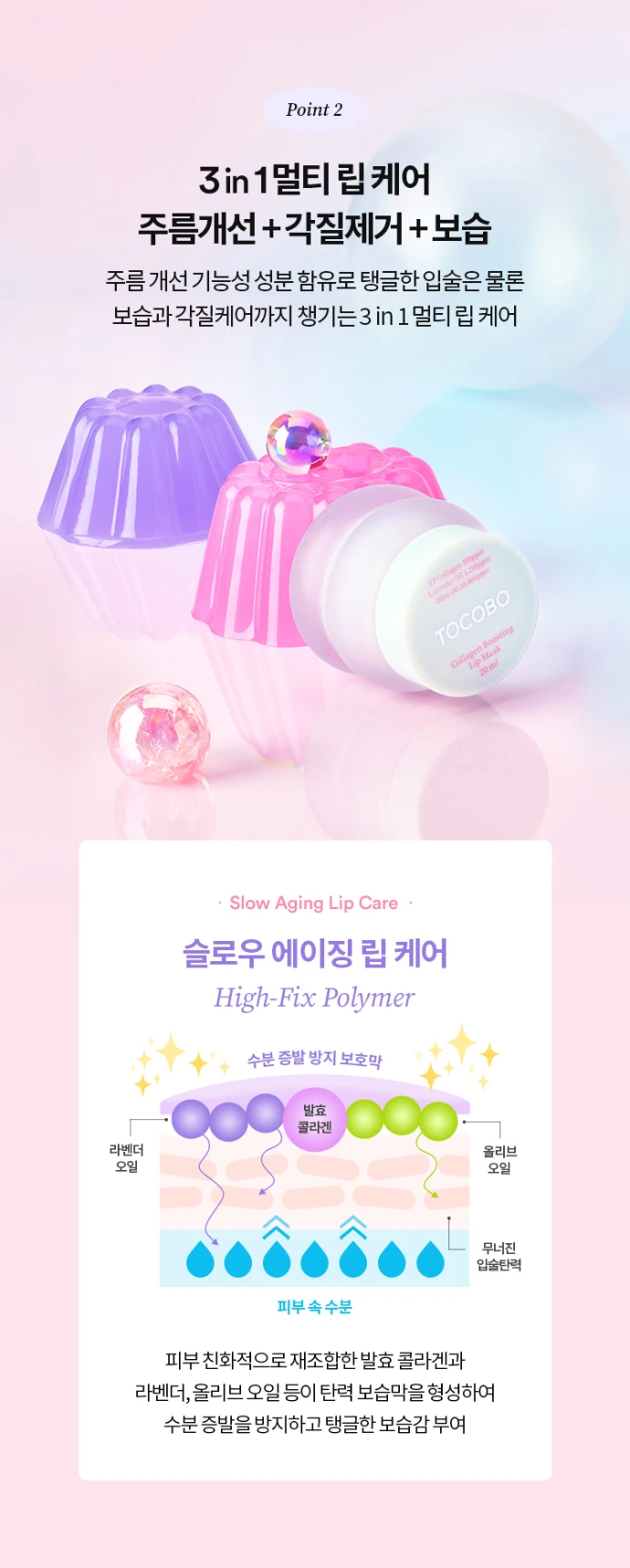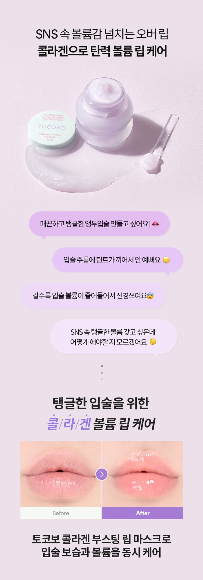 Découvrez Collagen Boosting Lip Mask de TOCOBO, un masque intensif pour des lèvres lisses, repulpées et hydratées. Son effet immédiat réduit les ridules, apportant volume et élasticité. Enrichi en collagène fermenté, il améliore la fermeté et offre un effet anti-âge visible après 4 semaines. Ce soin hydrate en profondeur, élimine les cellules mortes et adoucit les lèvres. Avec de l'huile essentielle de lavande pour un effet apaisant et de l'huile d'olive riche en vitamine E, il protège et nourrit intensément. Sa texture fondante assure confort sans coller. Idéal pour des lèvres sèches ou marquées, ce masque est parfait pour des lèvres visiblement plus jeunes.